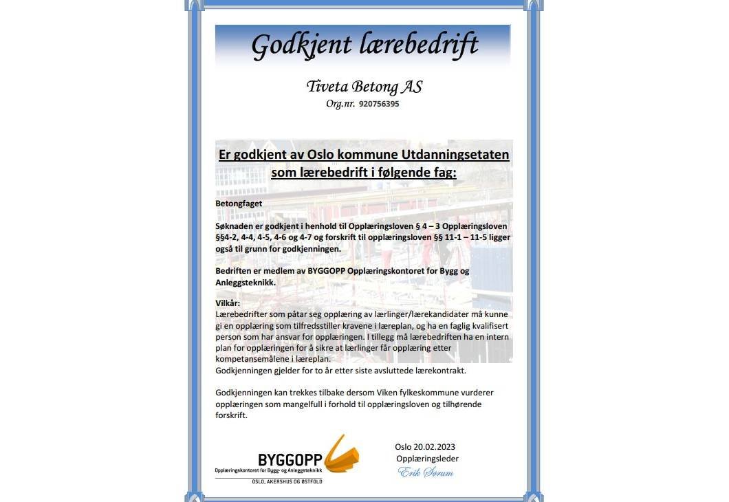 We just got approved by the Oslo Municipality Education Agency as an apprenticeship company in the concrete field.